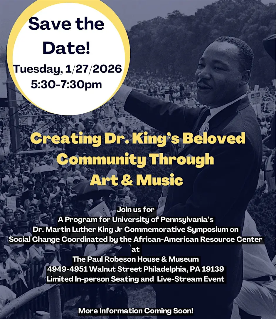 As part of the University of Pennsylvania’s Dr. Martin Luther King Jr. Commemorative Symposium on Social Change, this special program brings together artists, cultural leaders, and community voices to reflect on Dr. King’s vision of the Beloved Community. Through conversation, art, and music, we will explore how creative expression continues to play a vital role in advancing justice, fostering understanding, and nurturing collective care in our communities.